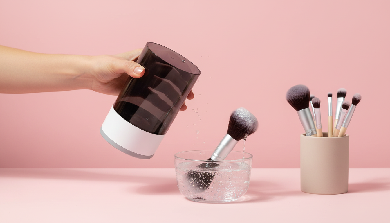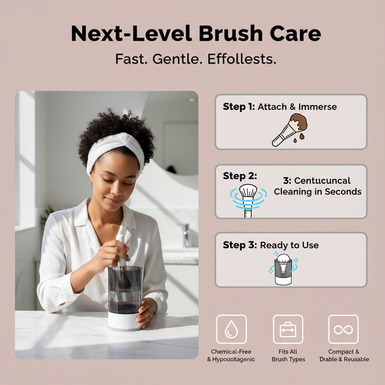 It spins brushes at high speed to remove makeup, oils, and residue without harsh chemicals.